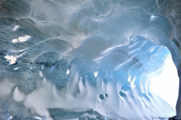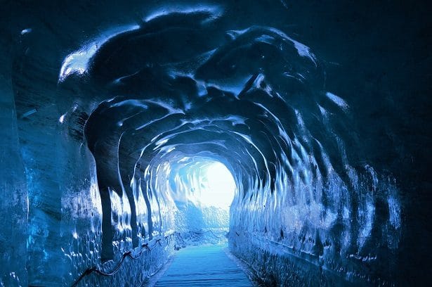 Accompagnés du guide et chercheur au CNRS Ludovic Ravanel, nous avons pris le petit train en gare de Chamonix à destination de la Mer de Glace. 20 minutes plus tard, nous voici sur le site du Montenvers surplombant la fameuse Mer de Glace à 1913 mètres de hauteur. La Mer de glace se forme par l’intermédiaire de deux glaciers qui se jettent dans la vallée. Pour se rendre dessus, il faut prendre une télécabine puis descendre les quelques 400 marches pour rejoindre la grotte sculptée dans la glace. A l’intérieur nous avons pu admirer le travail des sculpteurs de glace locaux et entrer dans l’antre de cette mer hors du commun.