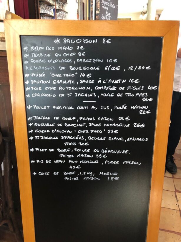 Sans modération par contre, on peut déguster les plats, qu’on présente sur l’ardoise. L’œuf mayo, le pâté en croute en passant par le foie gras au torchon, côtoient le cœur d’Aloyau et la frisée – signatures Maison – sans oublier les poissons selon arrivage, agrémentés d’épinards, purée, champignons de saison ou frites maison ! Le tout servi dans des assiettes au liseré rouge, gage d’authenticité.