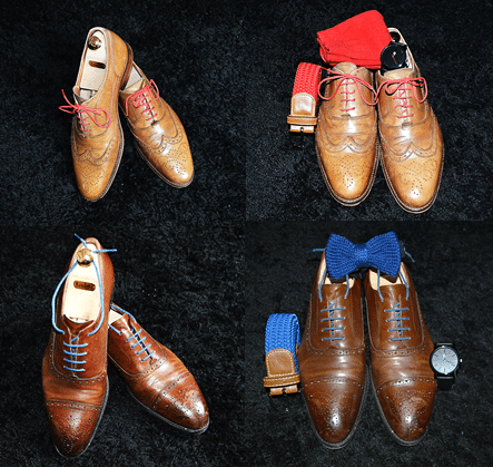 Surtout, ne pas sacrifier l‘harmonie avec le reste de la palette de couleurs de sa tenue, il faut chercher une simple coordination avec les couleurs des autres éléments de sa tenue, cela va tout simplement garder le reste de la tenue en sourdine et laisser vos lacets colorés parler de votre style personnel. Si vous voulez faire correspondre avec un autre élément dans votre tenue, tachez de respecter les nuances ; par exemple une paire de lacets pourpre avec une paire de de chaussettes couleur lavande légère pour une harmonisation sophistiquée. Notre conseil: Des lacets bleus électriques sur des chaussures de ville marron foncée. Des lacets rouges sur des chaussures marron crème. Le vert foncé passe aussi bien sur des bottines marron cognac. Bien entendu, nous devons retrouver un rappel de couleur sur votre tenue ou sur un accessoire du type montre, ceinture ou encore pochette de veste.