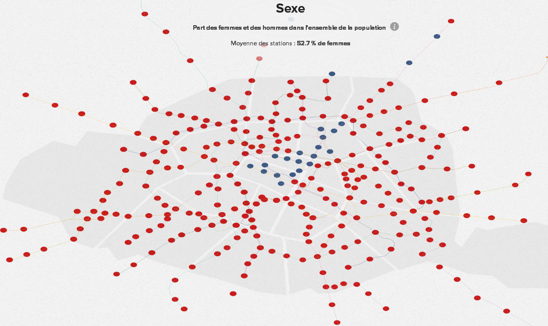 Les points rouges représentent les stations où la densité de femmes est plus importante que celle des hommes.