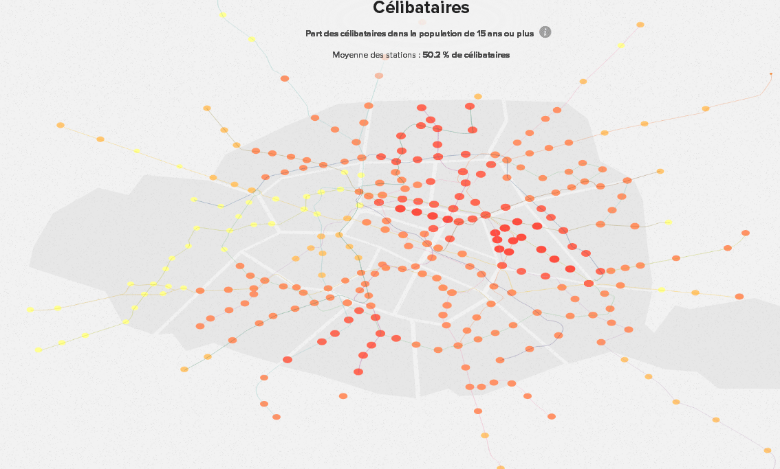 La moyenne de célibataires à Paris par station de métro est de 50,2%. Objectif, identifier les stations où le taux de célibataires est le plus élevé.