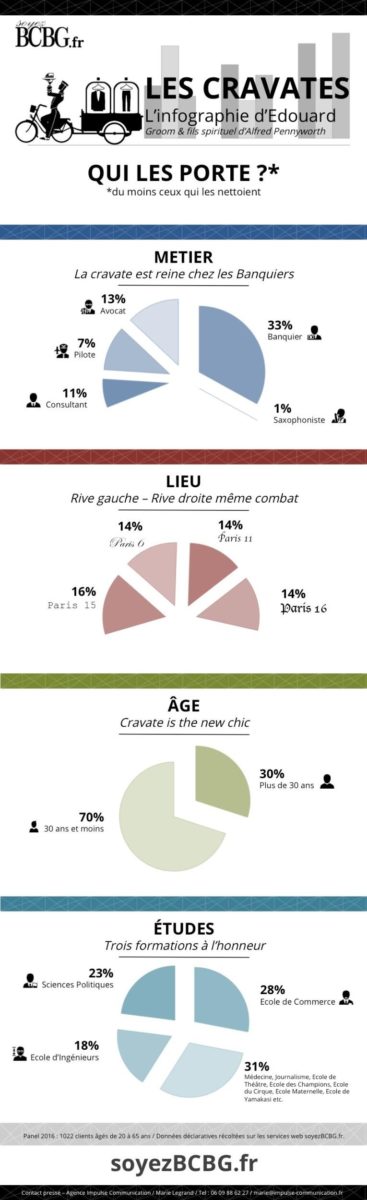 [dropcap]V[/dropcap]ous trouverez ci-dessous l’infographie réalisée par soyezbcbg.fr, service innovant de pressing, cordonnerie et retouches à domicile sur des créneaux de 20minutes sur le sujet : Cravates ! L’occasion de contredire certaines idées reçues : la cravate à un vrai succès chez les jeunes puisque 7 porteurs de cravate sur 10 ont moins de 30 ans. Et vous, portez-vous des cravates ?