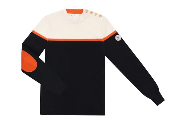 - Les boutons : Le pull marin peut être doté de boutons sur l’épaule, permettant un enfilage facile et un décolleté ajustable.