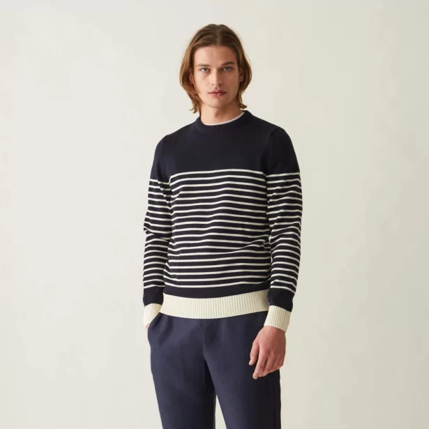- Les rayures : Les pulls marins ont souvent des rayures horizontales, qui étaient initialement conçues pour faciliter l’identification des marins en mer. Les rayures peuvent être de différentes couleurs, mais le bleu marine et le blanc sont les plus courants.