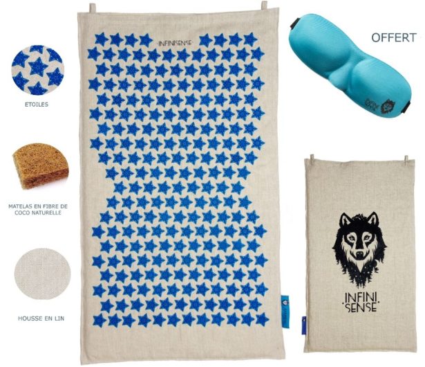 Le tapis d’acupression ressemble à un tapis de sol classique sur lequel sont accrochées plus de 200 étoiles comportant chacune 21 pointes en plastique. Ce qui représente au total plus de 4000 points de pression. J’ai testé le tapis d’acupression INFINISENSE. Celui-ci est conçu en lin et en fibre de coco. Cela lui permet d’être relativement épais et confortable une fois allongé dessus malgré les 4000 picots. Du coup, il ne ressemble pas à un tapis de gym. Au contraire, c’est un matelas aux vertus énergétiques et relaxantes.