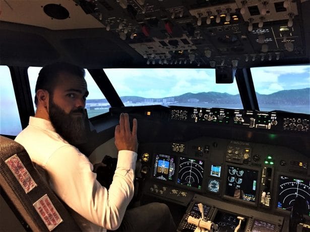 [dropcap]A[/dropcap] l’arrivée nous sommes accueillis non pas par un animateur mais carrément par un véritable pilote. La classe non ? Visiblement c’est du sérieux ! En entrant dans la salle du simulateur je suis assez impressionné par le cockpit. Tous ces boutons, toutes ces manettes, tous ces ordinateurs de bord, wouaahh ! Est-ce comme en vrai ? Oui, le simulateur a été reproduit à l’échelle d’un vrai cockpit Boeing 737.
