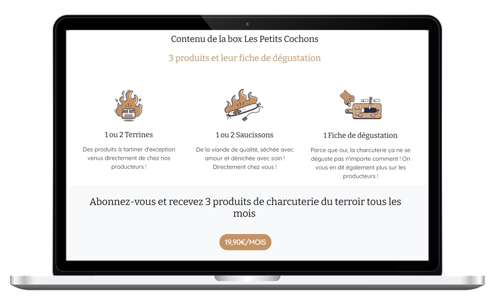 LES PETITS COCHONS, c’est une box par abonnement envoyant des pâtés, terrines et saucissons chaque mois à ses abonnés. Des produits du terroirs fabriqués dans le respect des traditions et des animaux à déguster en famille où entre amis. Des charcuteries 100% françaises, importées en circuit court auprès des producteurs.