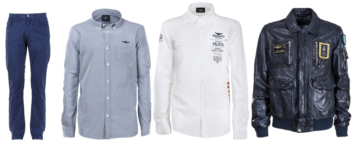 Malgré ses sources militaires, AERONAUTICA MILITARE ne propose pas de look strict et tiré à quatre épingles. Au contraire, les looks sont soit chics et décontractés soit sportwears.