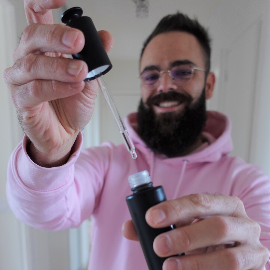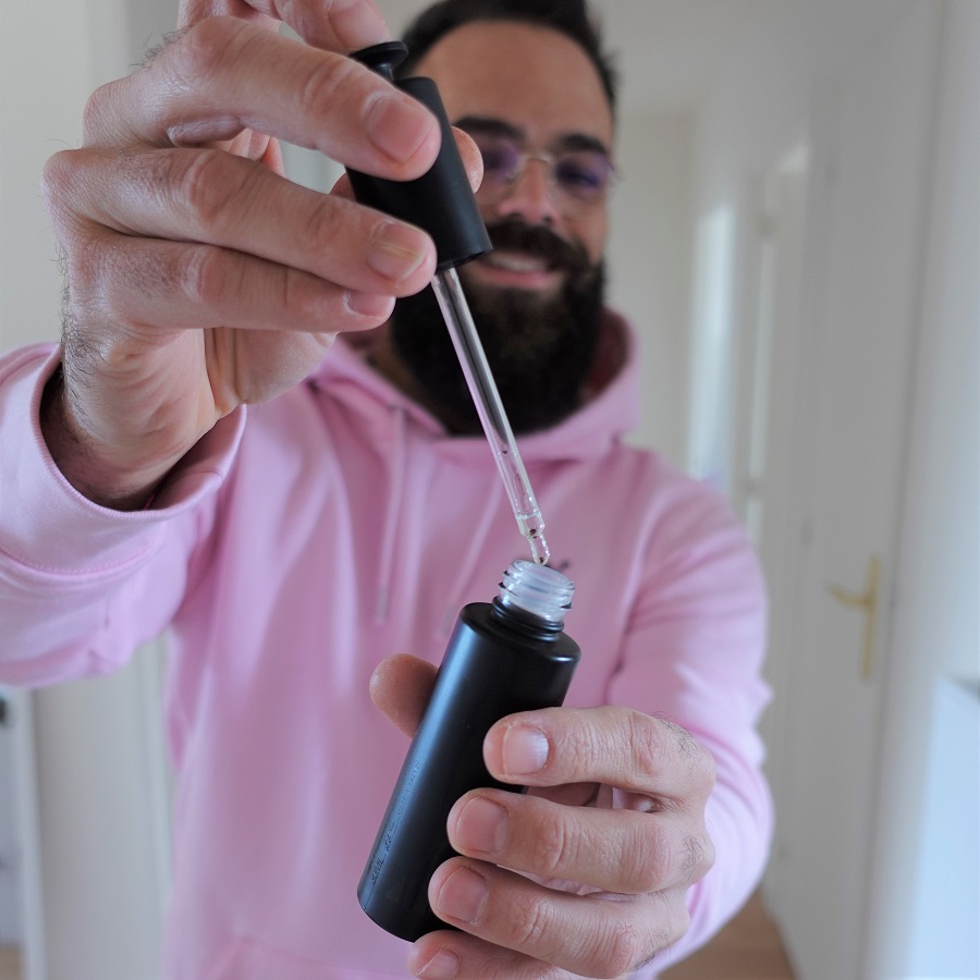 Après quelques jours de test, je l’ai adopté. Elle laisse le poil hydraté et doux. Aucune sensation de lourdeur, au contraire, je trouve ma barbe plus légère, souple. Côté brillance, pas de souci : cette huile pénètre les poils sans les graisser et les faire briller artificiellement. Côté packaging, le système de pompe et de pipette est très efficace. A ce niveau-là aussi c’est une première pour moi. Bravo !