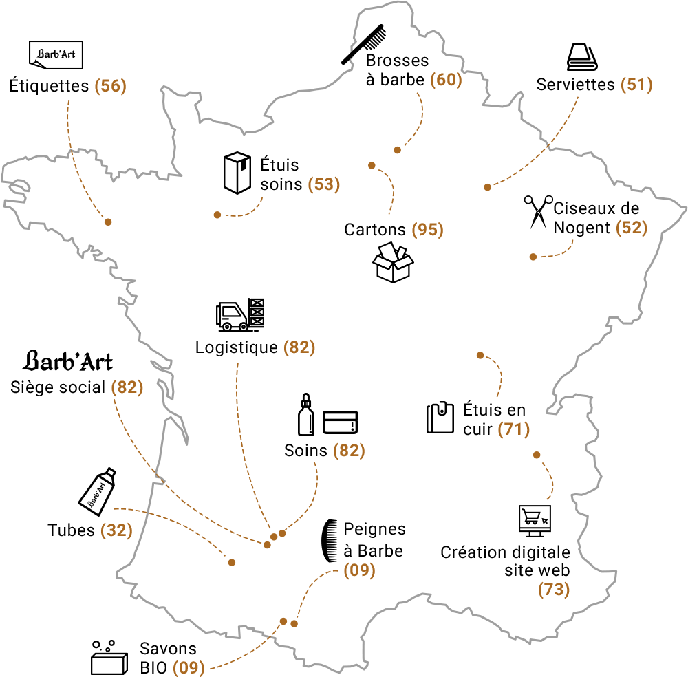 Au fur et à mesure, Barb’Art a su répondre aux besoins des barbus en proposant successivement des accessoires fabriqués en France (peignes, brosses à barbe, trousse de toilette en cuir), une gamme de savons bio, mais aussi tout une gamme de produits pour le visage, le corps ou encore les cheveux.