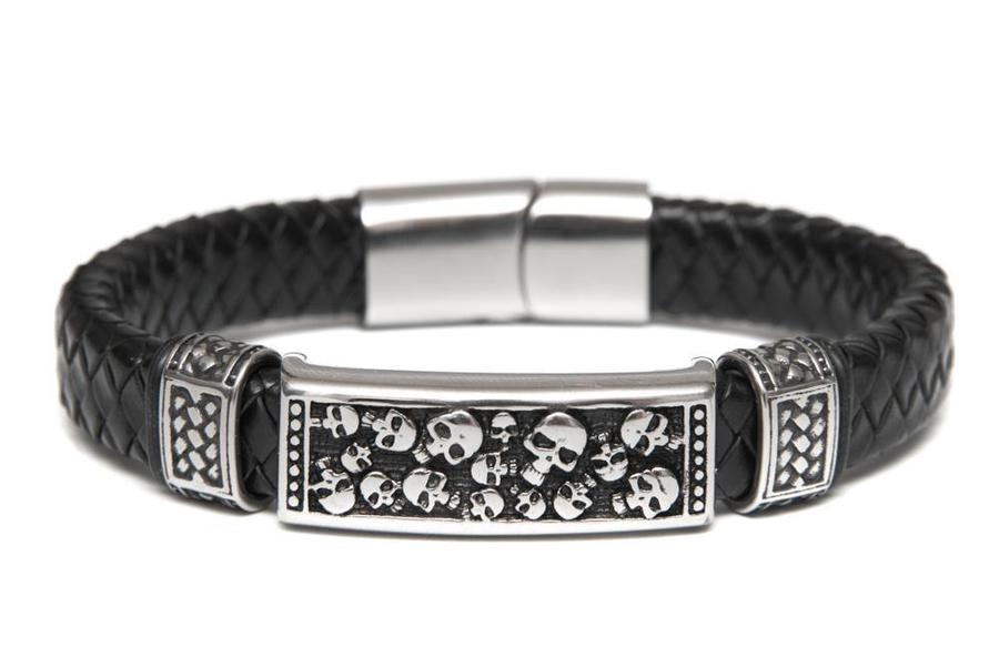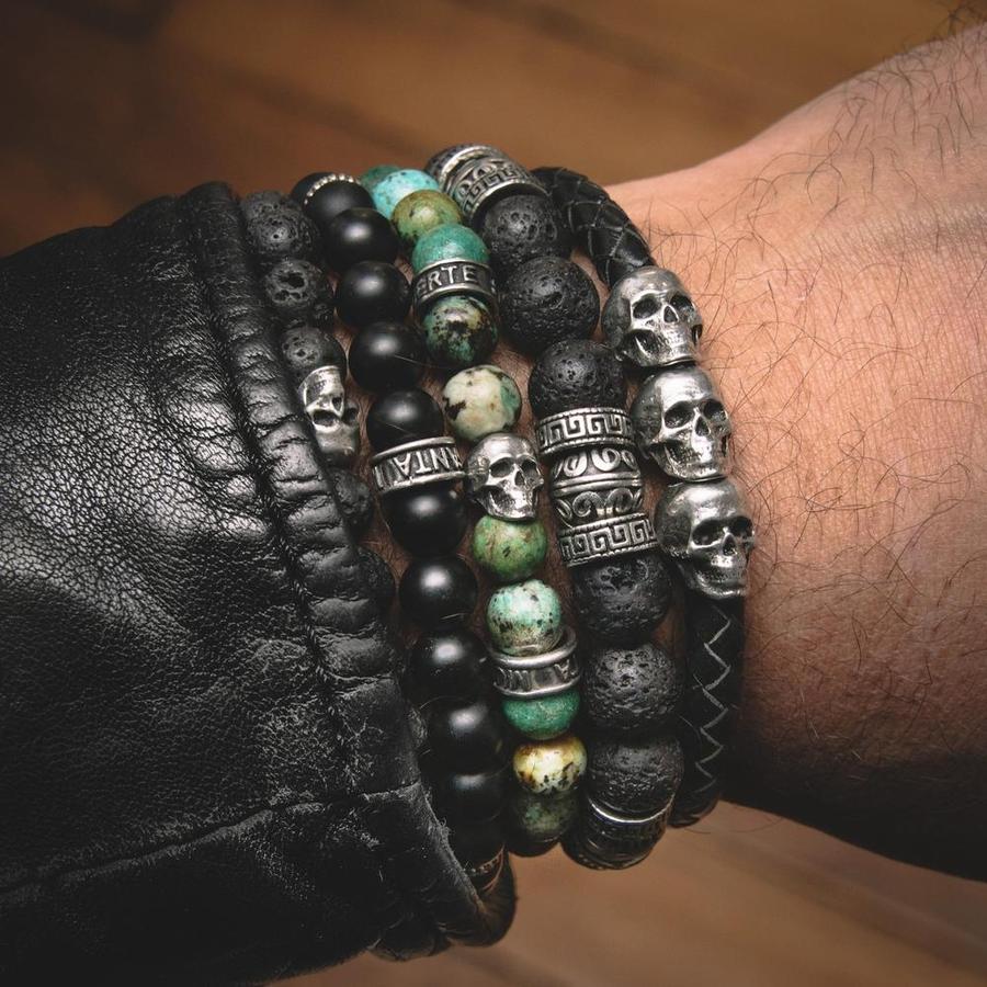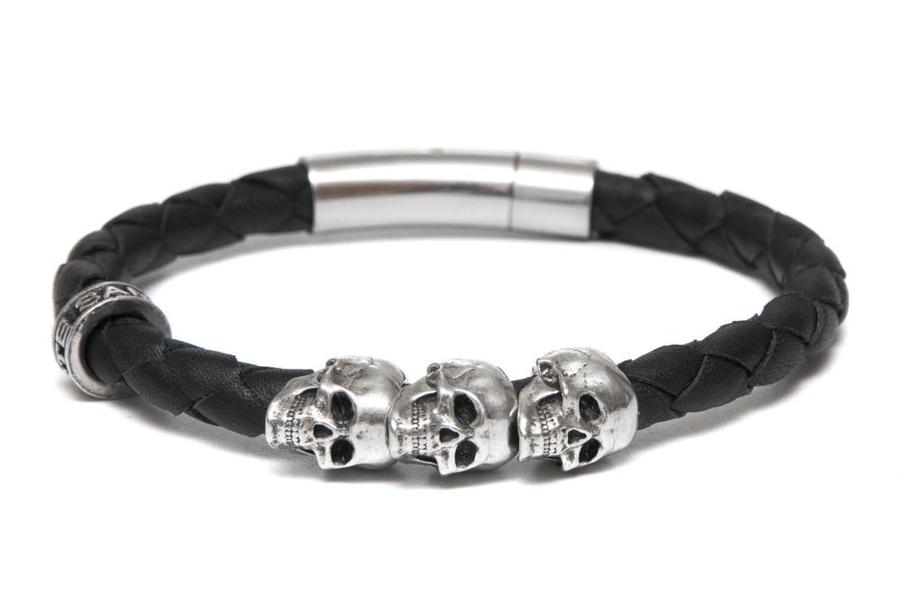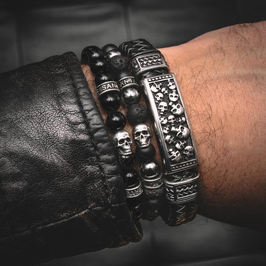 Et oui, pour affirmer son look Rock, la bague tête de mort ne suffit pas. Il faut l’agrémenter de bracelets en cuir aux 2 poignets. En cuir noir ou marron, le bracelet peut très bien lui aussi être sublimé par des motifs ou des perles en forme de têtes de mort. Les bracelets ci-dessous sont fabriqués en France dans les ateliers parisiens de Santa Muerte Paris. De véritables bijoux Rock accessibles pour moins de 50€.