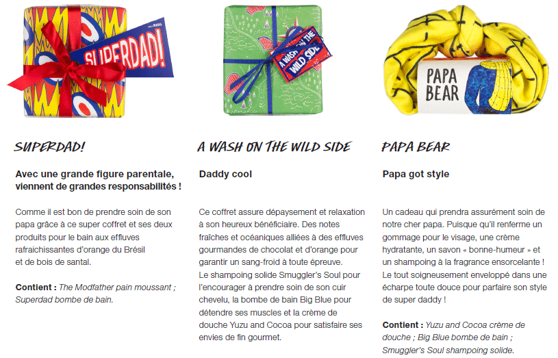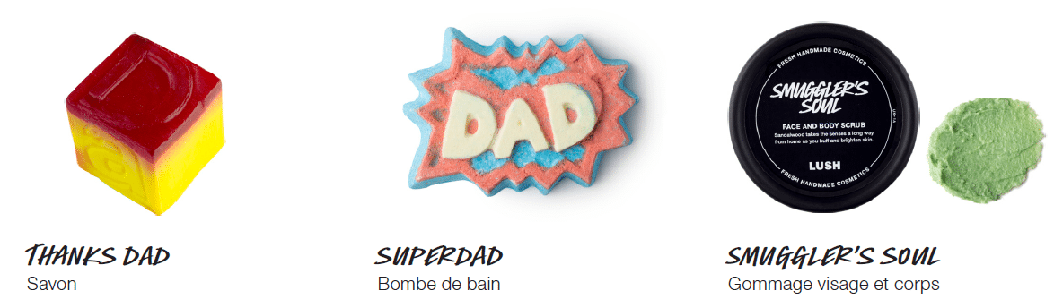 LUSH créateur de savons tendances a créé une gamme de savons et soins dédiés aux papas. C’est l’occasion de réaliser un cadeau utile, original et pas trop cher. La marque à même prévu des coffrets spéciaux pour les super papas qui ont besoin de se détendre et prendre soin d’eux.