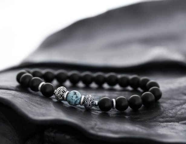 C’est l’une de mes créations préférées. En effet, voyez la sobriété du bracelet de perles agate noires dépolies, 2 perles en argent massifs finement travaillées et cette magnifique perle turquoise Africaine. Rien de tape à l’œil, tout dans l’élégance et la discrétion à l’image de celui qui aura la chance de le porter. Son prix : 90€ à s’offrir ou à offrir d’urgence !