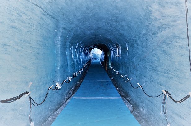 Accompagnés du guide et chercheur au CNRS Ludovic Ravanel, nous avons pris le petit train en gare de Chamonix à destination de la Mer de Glace. 20 minutes plus tard, nous voici sur le site du Montenvers surplombant la fameuse Mer de Glace à 1913 mètres de hauteur. La Mer de glace se forme par l’intermédiaire de deux glaciers qui se jettent dans la vallée. Pour se rendre dessus, il faut prendre une télécabine puis descendre les quelques 400 marches pour rejoindre la grotte sculptée dans la glace. A l’intérieur nous avons pu admirer le travail des sculpteurs de glace locaux et entrer dans l’antre de cette mer hors du commun.
