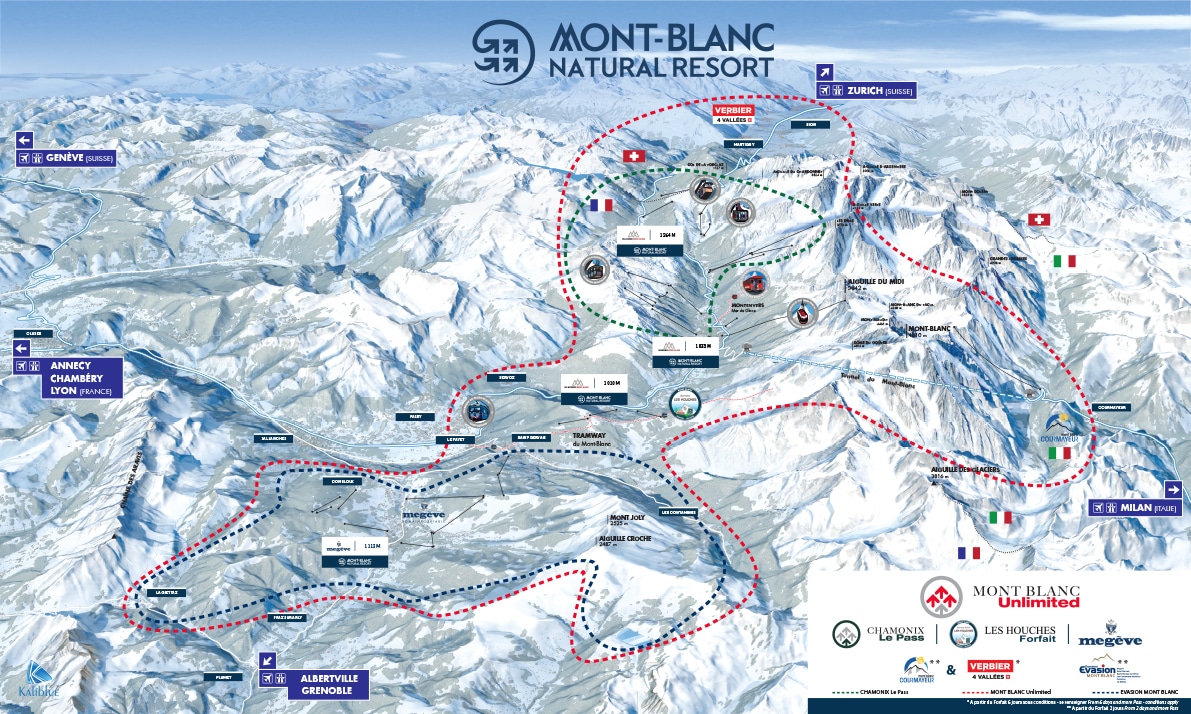 Si vous avez envie de profiter de l’ensemble du domaine skiable Mont Blanc Natural Resort, je vous conseille fortement de choisir le forfait « Mont Blanc Unlimited ». Celui-ci vous ouvrira les portes des domaines suivants sur 3 pays pour 299€ les 6 jours.