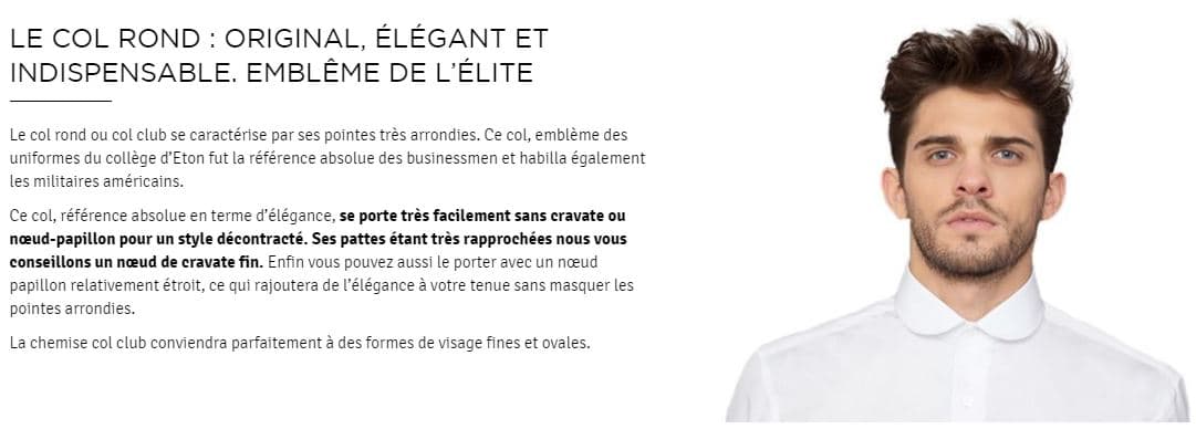 - SWANN & OSCAR : Créez votre chemise sur mesure en 8 étapes. L’élégance, simplement. Retouches gratuites. Interface en ligne simple avec un large choix de cols parmi lesquels on retrouve les cols rond : col anglais et col dandy. A découvrir ici >>