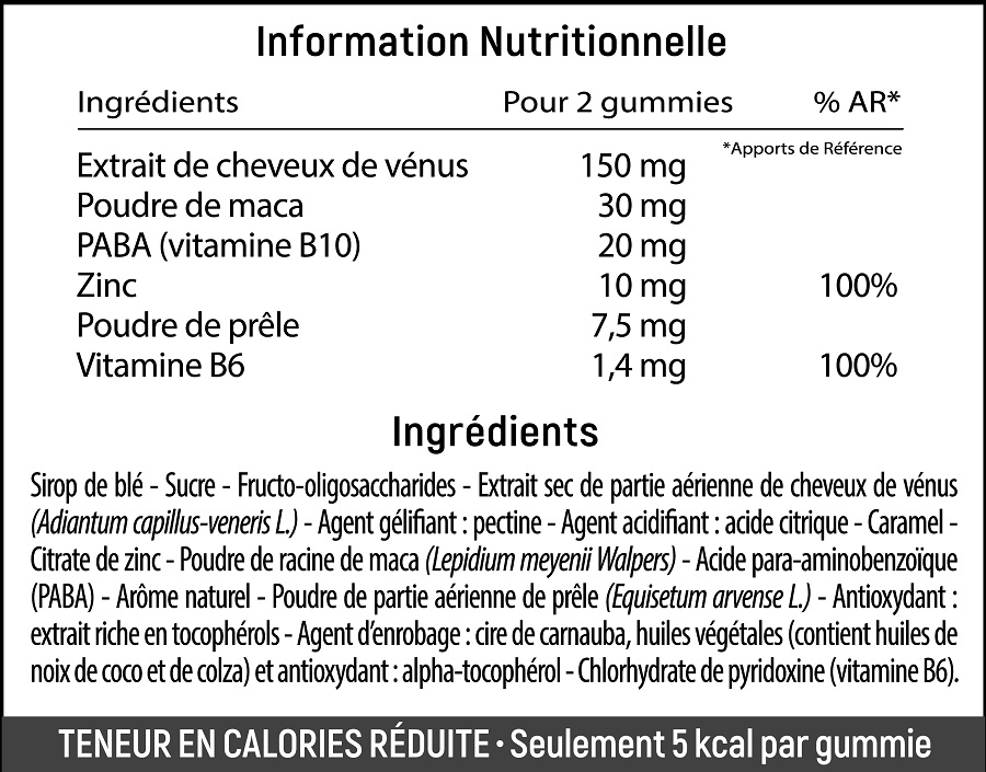 Ces gummies à l’aspect sympathique sont conçus pour prévenir et stopper la chute occasionnelle ou chronique des cheveux, retarder les débuts de calvitie, lutter contre le vieillissement capillaire, stimuler la croissance et renforcer la densité du cuir chevelu, en favoriser la repousse et la santé, booster la synthèse de kératine…de quoi redonner des cheveux en bonne santé.