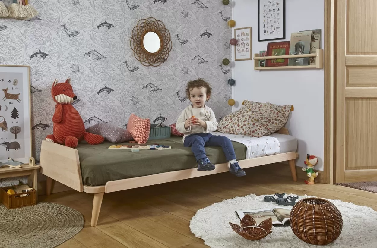 - Le lit au sol (type Montessori), parfait pour favoriser l’autonomie et éviter les chutes.