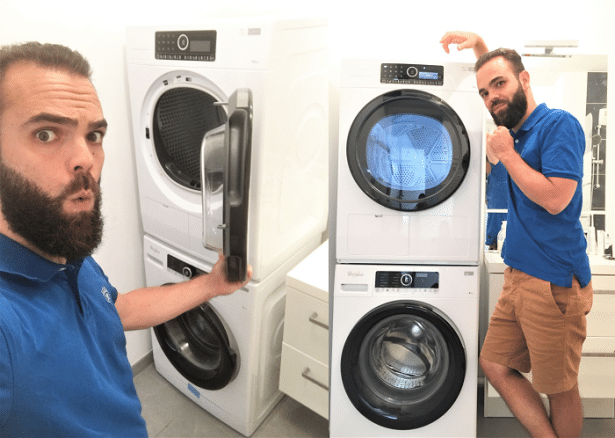 Nous n’avons pas tous l’espace suffisant pour mettre cote à cote deux machines de ce calibre. Ce qui se fait donc de plus en plus en ce moment c’est la superposition des éléments. Pour ce faire il faut idéalement investir dans deux machines de la même marque créées pour être posées l’une sur l’autre : machine à laver en bas et sèche-linge sur le dessus. Avec mes deux machines Whirlpool de la gamme Supreme Care, c’est impeccable d’autant plus que ces deux-là ne vibrent pas quand elles sont en marche.