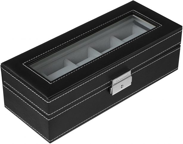 Avantages : Une boite relativement solide vous permet de protéger vos montres de la poussière mais également des cous ou encore des chutes. Autre avantage, en fonction de la taille une boite de montres peut en contenir parfois une dizaine. Donc c’est parfait pour les gros collectionneurs. Attention, au niveau esthétique il est important de choisir une boite de montres raccord avec la déco de votre chambre.