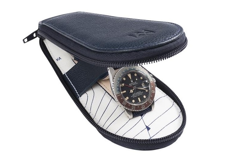 Autre coup de cœur, cet étui pour 1 montre modèle « Voyageuse GENEVA navy » toujours proposé par Avel & Men. Cuir foulonné pleine fleur, doublure coton, fermeture zip façon compagnon, cet produit est une pure merveille pour celui qui veut transporter sa montre toute en douceur et en toute sécurité. Prix : 124€ – existe aussi couleur cognac et bordeaux.