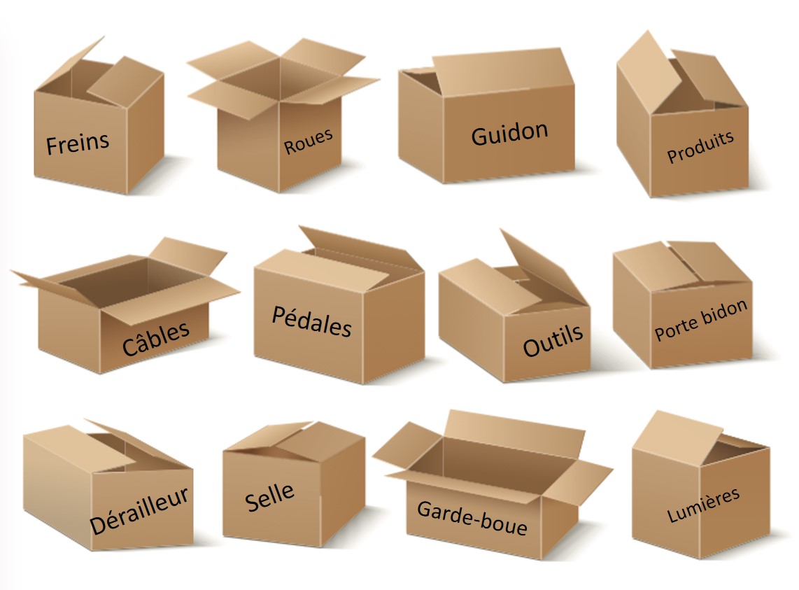 Il faut savoir que lorsque vous commencez à démonter le vélo, vous vous retrouvez rapidement avec des dizaines de vis, d’écrous, de rondelles, de câbles, des morceaux de freins …Bref plein de pièces détachées qui deviennent au moment de remonter le vélo, un véritable puzzle et plus précisément un casse-tête. Mon conseil : munissez-vous de petites boites ou cartons et placez-y les éléments un par un sans les mélanger. Par exemple, tous les éléments de freins dans une même boite …N’hésitez pas non plus à poser des étiquettes sur les éléments afin de vous rappeler la provenance et de quel côté doit se remonter la pièce.