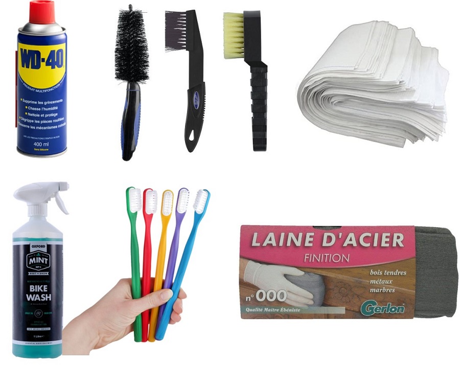 - Ensuite, eau chaude + savon dégraissant + brosse pour nettoyer le cadre, les roues et les éléments gras comme la chaine et le pédalier. Pour les petites pièces, je vous conseille d’utiliser de vieilles brosses à dent.