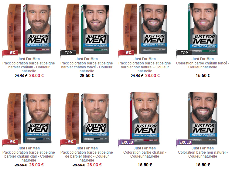 La marque Just For Men propose une large gamme de produits de coloration de barbe. Pour moins de 15€ changez de style !