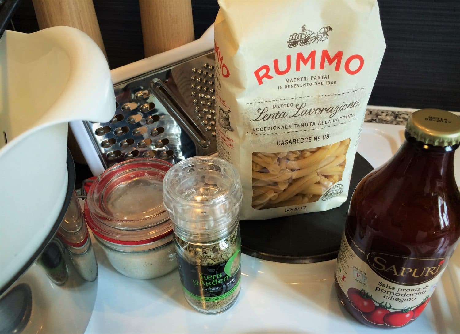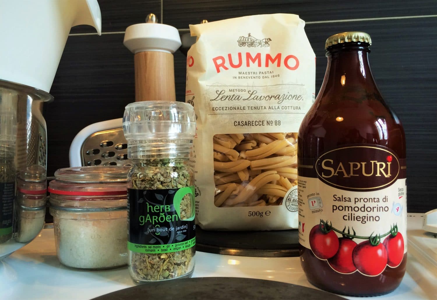 - Pour lui faire un bon petit plat: un paquet de pâtes traditionnelles italienne RUMMO + un succuleuse sauce de tomate cerise cuisinée + un moulin d’herbes aromatiques.