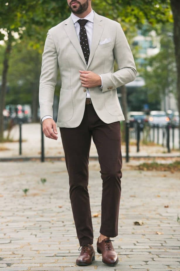 Agrémenté d’une cravate en laine marron à pois blancs et d’une paire de Richelieu en cuir marron. Voyez comme la chemise blanche reste le socle de tous les looks ci-dessus. Découvrez ce look ici >>