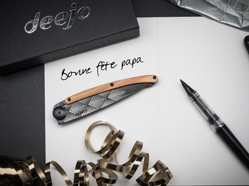- Et pour finir : Un texte personnalisé : écrivez en petit sur le manche du couteau de poche personnalisable Deejo, soit un petit message, soit le prénom ou surnom de votre père pour une personnalisation parfaite.