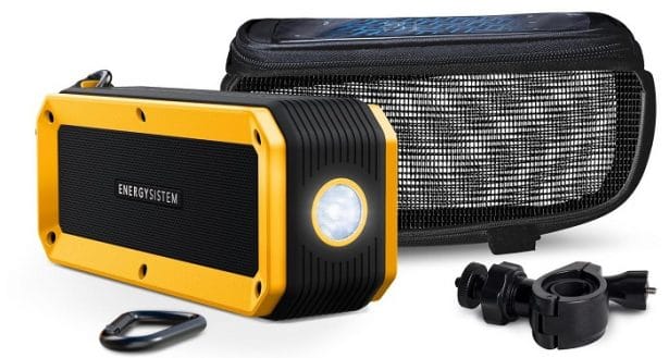L’Energy Outdoor Box Bike inclut tous les accessoires nécessaires pour être fixée sur un vélo : fixation guidon et sac à dos pour fixer l’enceinte au cadre avec un compartiment pour le smartphone.