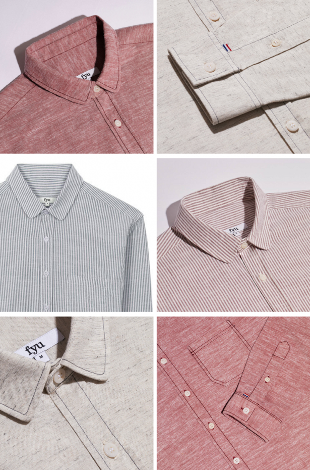 Chaque modèle de cette nouvelle collection a été baptisé par la communauté FYU dans une logique d’association et d’exploration géographique. On retrouve ici la chemise Saint-Malo (rayée gris et bleu), Arcachon (rayures bordeaux), Concorde, Toulouse (Rose), Concarneau (gris clair pucé de gris foncé).