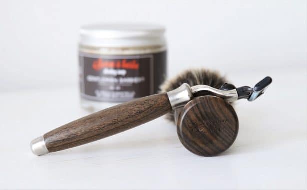 J’ai choisi un ensemble rasoir et blaireau avec des manches en bois de pistachier. C’est un bois rare et sublime à en juger par ses différentes teintes. J’aime aussi son côté vintage ce qui accentue pour moi le plaisir d’utiliser ce genre d’accessoires.