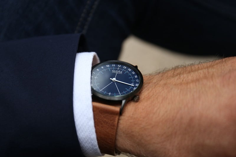 Tous les bracelets proposés par la marques sont interchangeables grâce au système de barrette à ergot. Une simple pression avec le doigt et l’on change son bracelet selon son humeur ou la tenue du jour. GUSTAVE & cie propose 8 bracelets donc 3 milanais en métal (noir, argent et or rose) 4 bracelets en cuir véritable (marron, noir, bleu et vert) et 1 bracelet en tissu bleu.