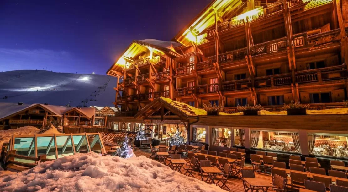 Prenez un gros chalet à 50 mètres des pistes avec une vue imprenable sur le domaine ou sur la vallée. Aménagez sur ses 7 étages 92 chambres et suites de 21 à 48 m2 – les plus grandes hébergeant jusqu’à 4 personnes : voici le Pic Blanc, un hôtel 4 étoiles qui se caractérise par sa décoration à la fois moderne et élégante, qui plébiscite le bois, le rouge pour la moquette, le gris pour les fauteuils, et la fourrure pour le jeté de lit. Les larges baies vitrées du restaurant ferait presque oublier ce qu’il y a dans l’assiette.