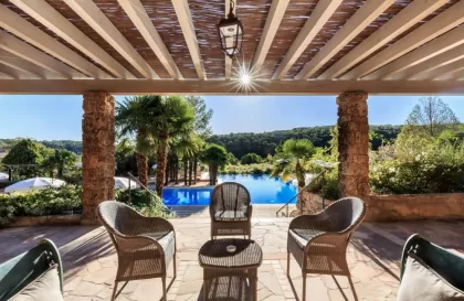 Un parc aux allures sauvages, conçu avec une grâce inégalée, des arbres centenaires et des bambous, et une piscine en pierre qui s’intègre parfaitement à l’environnement, La Divine Comédie séduit par son raffinement et l’originalité de la décoration.