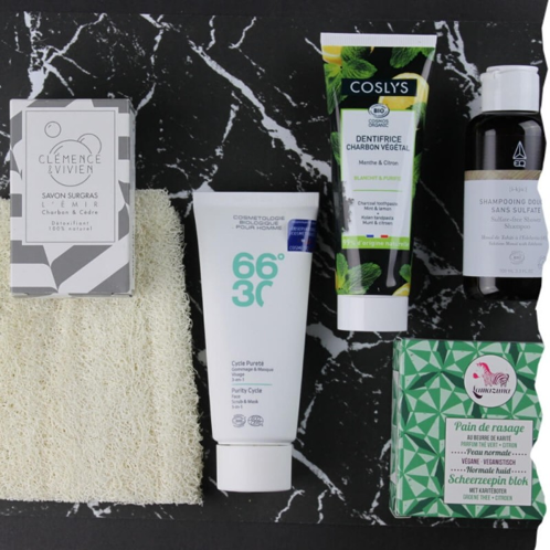 Cette box est très complète et propose les essentiels de la beauté. Ici, par exemple : un dentifrice naturel au charbon, un shampoing, un savon surgras (pour protéger ma peau sensible), un pain de rasage, un gommage et son loofah !