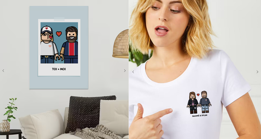 En lieu et place de la traditionnelle photo de couple en mode selfie improvisé sur la plage, vous avez la possibilité de créer vos personnages LEGO et les encadrer pour ensuite décorer de manière tendance votre intérieur. Pour chaque personnage, vous avez vraiment la possibilité de tout personnaliser : la tête, les cheveux, l’expression du visage, les vêtements … Je trouve cela vraiment très cool ! A partir de 40€ du format A4 au A2 en passant par du A3. En savoir + ici >>