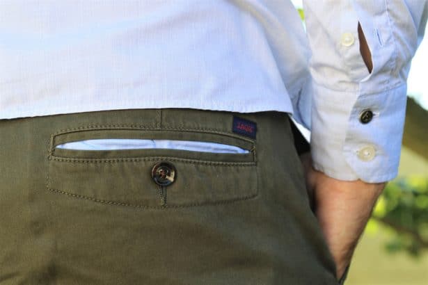 Ce Chino JAQK se fait remarquer par son confort. Il est taillé parfaitement pour s’y sentir à l’aise tout en proposant une silhouette généreuse. Voyez le travail de broderie et couture sur les poches postérieures : rien n’est laissé au hasard. Ça tombe bien, la poche intérieure est raccord avec la couleur de ma chemise 😉
