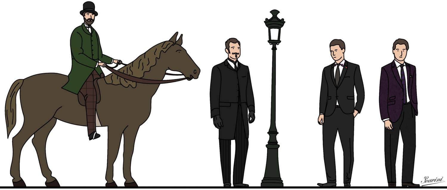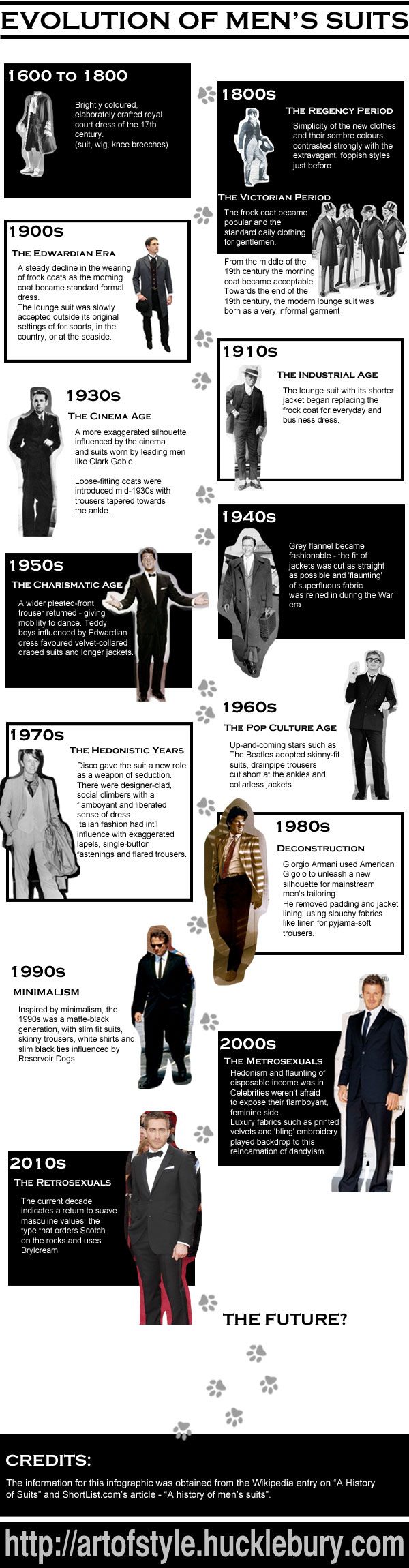 Voici une infographie qui vous retrace dans le temps, l’évolution du costume pour homme. Cela donne un bon aperçu des changements vestimentaires, de style que les années ont pu avoir et marquer.