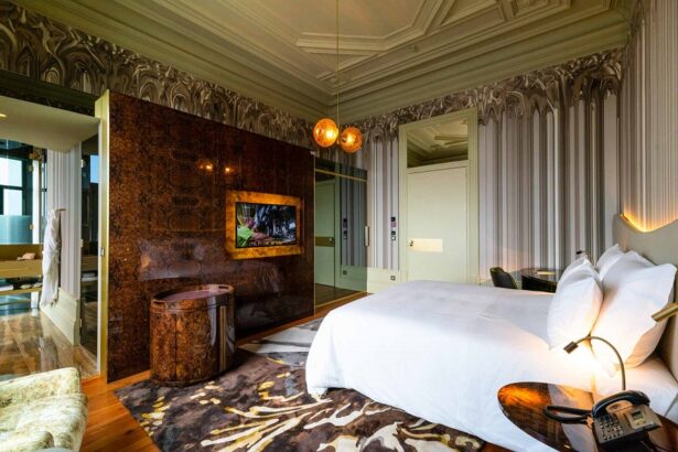 À l’intérieur de la bâtisse cossue, 68 chambres et suites avec panorama époustouflant ont été décorées par Nina Andrade Silva dans tes tons de vert et de bronze qui contrastent avec les bois nobles et les dorures.