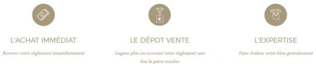 - Le dépôt-vente : c’est la garantie de gagner un peu plus d’argent dans la mesure où vous êtes payés lorsque que le bien est vendu. Grâce à son réseau de vente international votre bijou à toutes les chances d’être vendu dans les meilleurs délais en France ou à l’étranger.