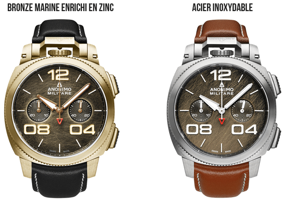 [dropcap]C[/dropcap]ette montre se différencie notamment par les matériaux qui la composent comme l’acier, l’acier traité DLC, le titane et surtout le bronze marine enrichi en zinc. En effet, ANONIMO fut parmi les premiers créateurs de montres de luxe à utiliser du bronze enrichi en zinc pour confectionner ses boîtiers ultra résistants. Par exemple, le modèle « Militare Chrono » ci-dessous est doté de ce fameux boitier en bronze.