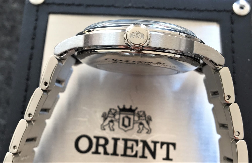 Autre détail important : la couronne est divinement travaillée. Finement dentelée autour et légèrement usinée sur les bords, le logo ORIENT vient garnir délicatement la base extérieure de la couronne.