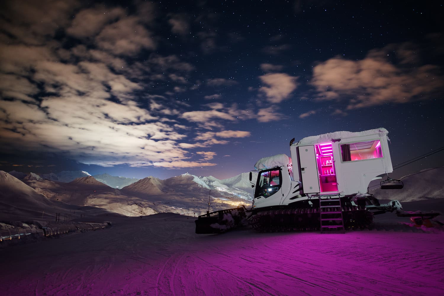 C’est en effet une drôle d’invention mais qui je vous l’assure vaut son pesant de cacahuètes. Sur le dos d’une véritable dameuse les créateurs du concept ont posé une cabine dans laquelle les guests passeront la nuit.