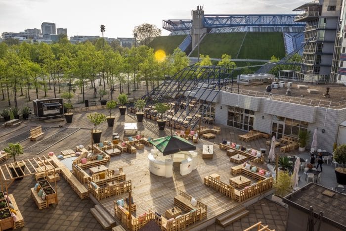 De mai à septembre, le Papa Cabane s’installe rue Paul Belmondo, derrière l’AccorHôtels Arena dans le 12 ème arrondissement de Paris. A cette occasion, 1 000 m2 de terrasse sont déployés face au parc de Bercy. Un espace unique en son genre.