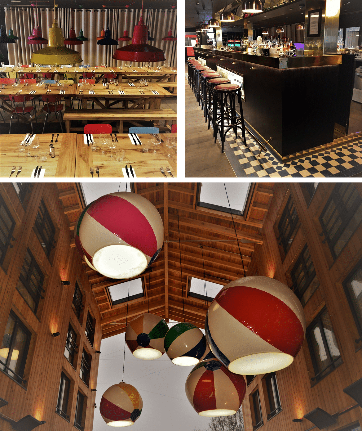 Au rez de chaussez, un grand et superbe bar trône au milieu de la pièce. Autour, des tables sont disposées pour diner ou simplement prendre un verre. Les couleurs sont vives, la déco moderne et branchée, le style est chaleureux et convivial. On s’y sent rapidement comme à la maison. D’autant plus que des bouteilles d’eau sont en libre service, tout comme le thé et le café. Sous les différents préaux vous y trouverez des baby foots et des tables de ping pong et des canapés d’extérieur pour se poser entre amis pour l’apéro.