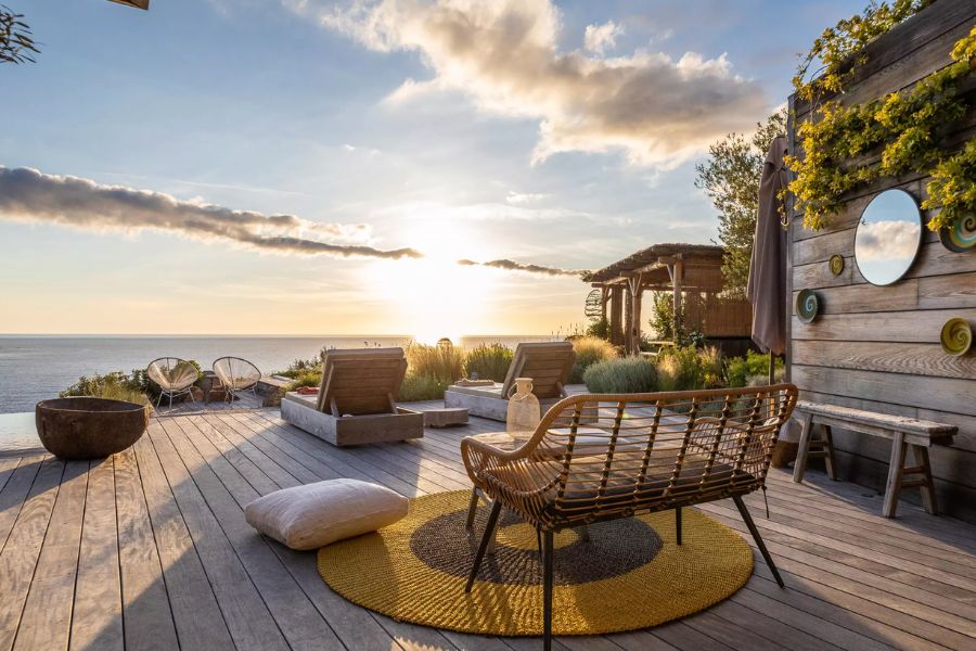 Pouvant accueillir huit personnes dans quatre chambres, A Nepita jour la carte bohème, avec terrasse en bois exotique, meubles en rotins et touches tropicales.