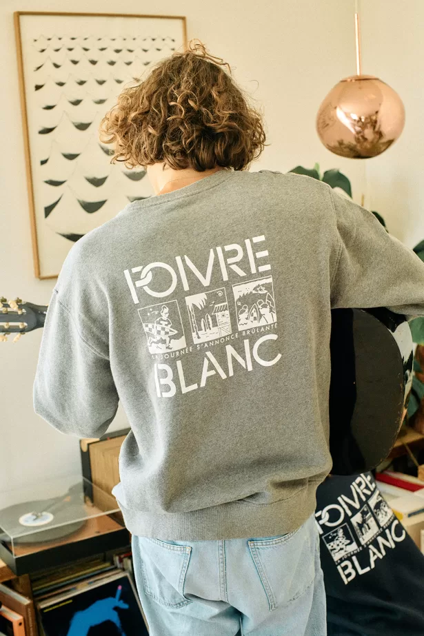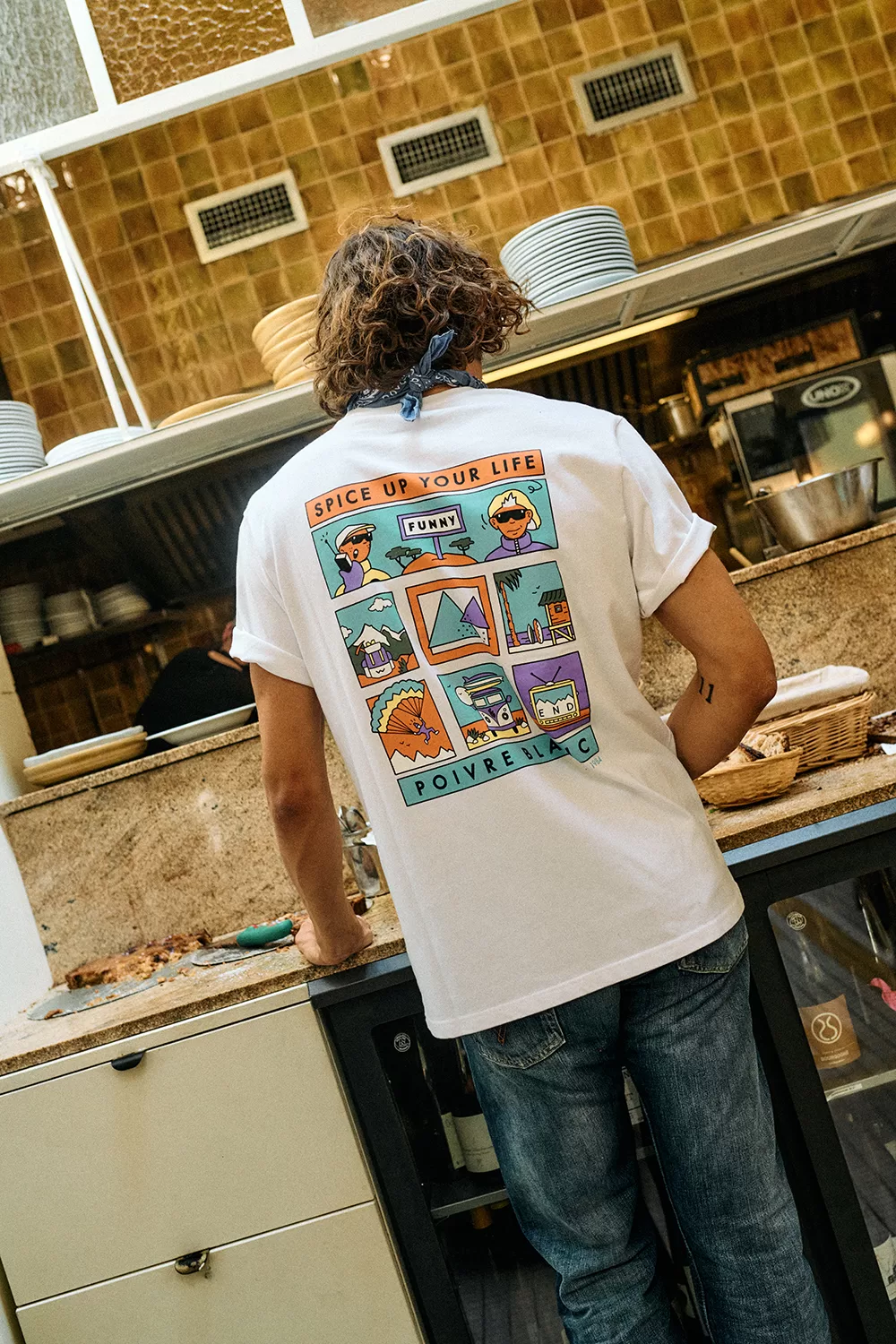 - Le t-shirt graphique vintage : imprimé “Poivre Blanc 1984” ou logo rétro revisité. Se porte aussi bien seul qu’en superposition avec une surchemise.
